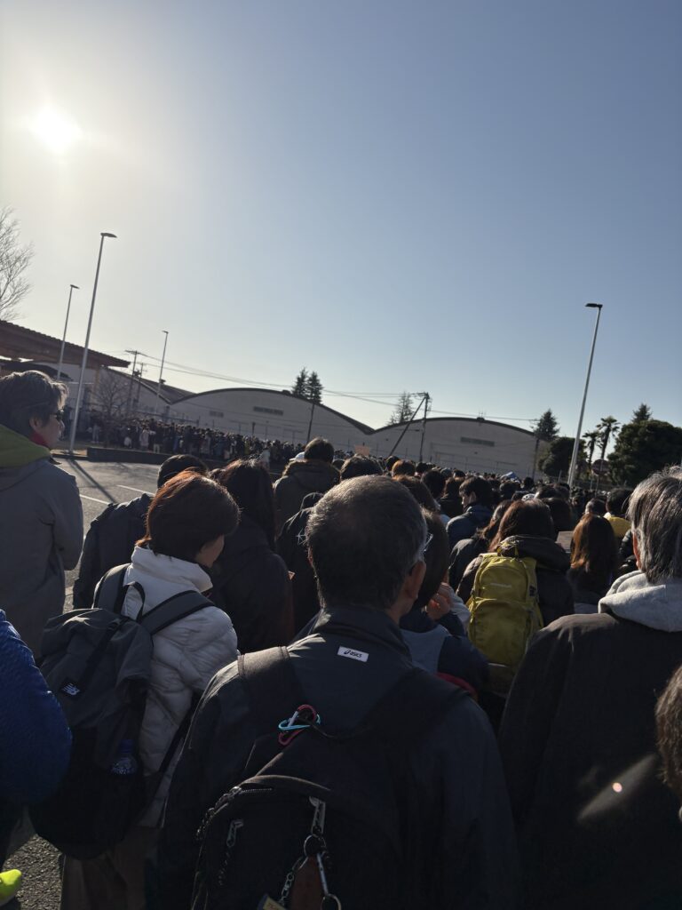 やっと、身分証明書と参加ハガキのチェックを受けたのですが、そこから荷物検査の場所まで遠い。と、なんか、脇の入り口からどんどん荷物検査をスルーする人たちが駆け出しています。
