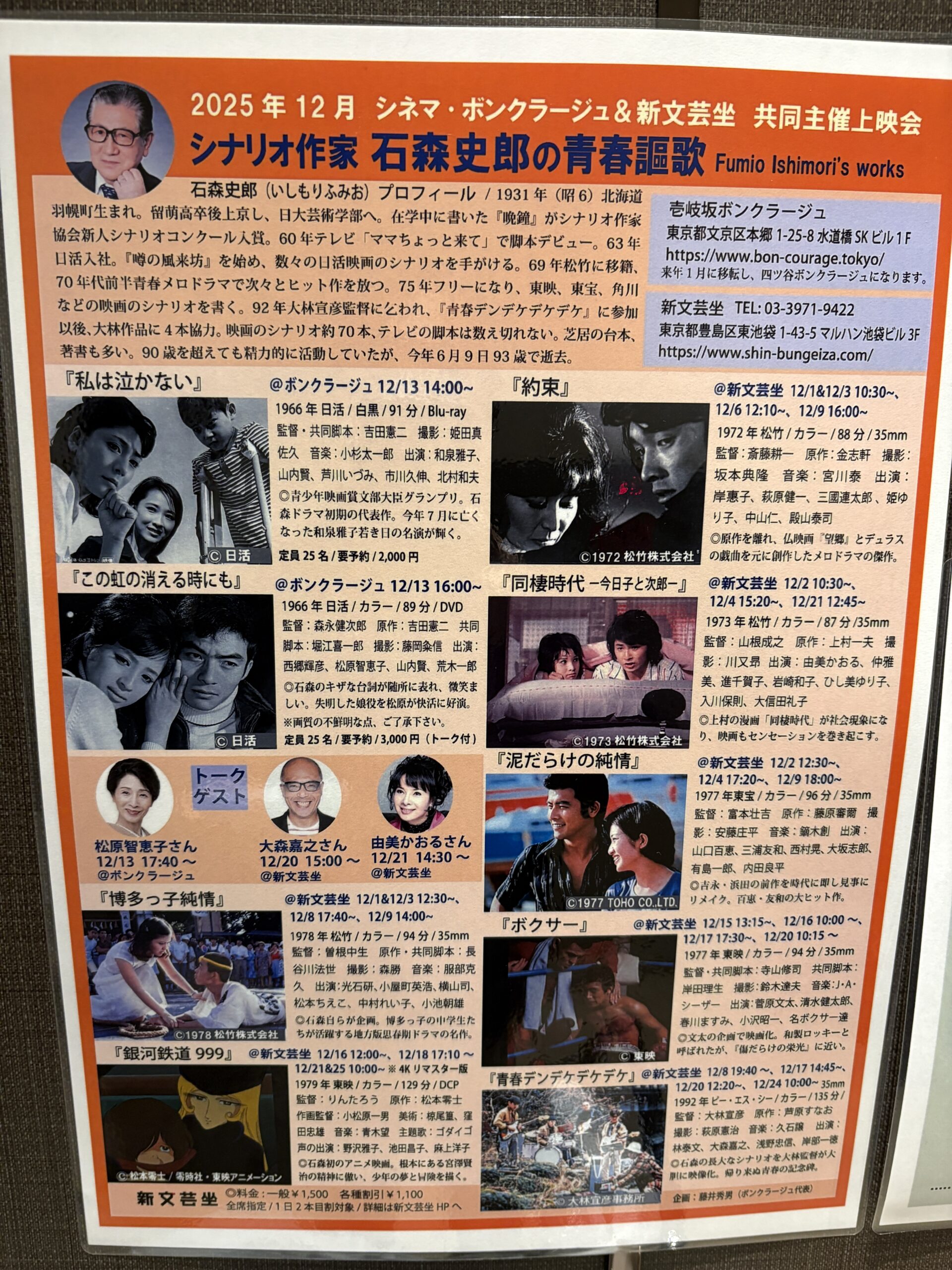 池袋新文芸坐に行き、特集「シナリオ作家 石森史郎の青春謳歌」ということで、シナリオを担当した映画「ボクサー」と「青春デンデケデケデケ」を見てきた。